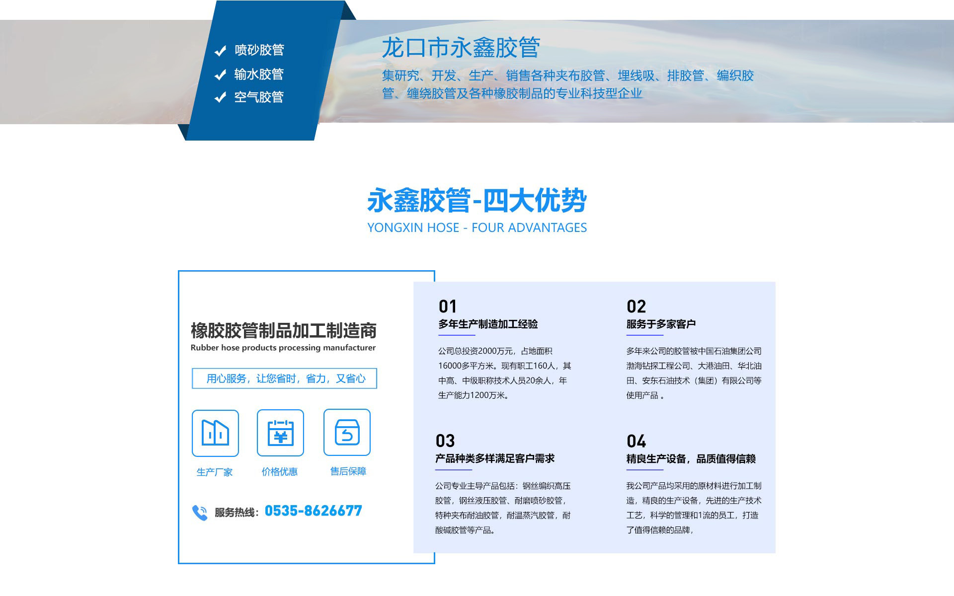 龍口市永鑫膠管有限公司始建于1979年。位于山東半島北端——龍口市,毗鄰龍口港、威烏高速公路和大萊龍鐵路,商業(yè)運(yùn)輸,交通方便,地理位置好。公司總投資2000萬元,占地面積16000多平方米。現(xiàn)有職工160人,其中高、中級職稱技術(shù)人員20余人,年生產(chǎn)能力1200萬米。多年來公司的膠管被中國石油集團(tuán)公司渤海鉆探工程公司、大港油田、華北油田、安東石油技術(shù)(集團(tuán))有限公司等使用產(chǎn)品我公司迎著十八界三中全會的改革大潮始終闊步向前,目前我公司主要從事高低壓橡膠軟管、鉆探膠管、夾布膠管、噴砂膠管、橡膠管帶制品,等產(chǎn)品的生產(chǎn)和研發(fā),主導(dǎo)產(chǎn)品包括:生產(chǎn),研制高低壓橡膠軟管、輸送皮帶等以橡塑為主的產(chǎn)品,擁有各類進(jìn)口,國產(chǎn)生產(chǎn)設(shè)備120多臺套,化驗,分析,試驗儀器設(shè)備種類多,檢測手段完善。我公司產(chǎn)品均采用的原材料進(jìn)行加工制造,精良的生產(chǎn)設(shè)備和穩(wěn)定技術(shù)工藝,科學(xué)的管理,打造了客戶信任的牌子,先后與多家石油、化工、汽車制造等大型國有企...